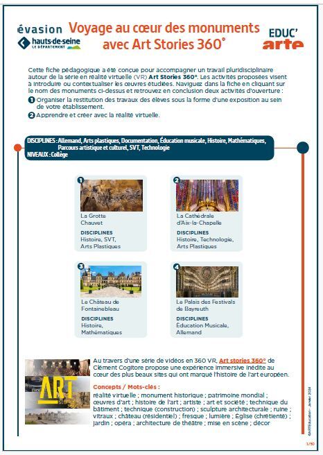 Plongez-vous dans un travail pluridisciplinaire autour de la série "Art Stories 306°" en réalité virtuelle (VR). Les activités proposées visent à introduire ou contextualiser les monuments étudiés : la grotte Chauvet, la cathédrale d'Aix-La-Chapelle, le château de Fontainebleau, le Palais des Festivals de Bayreuth.